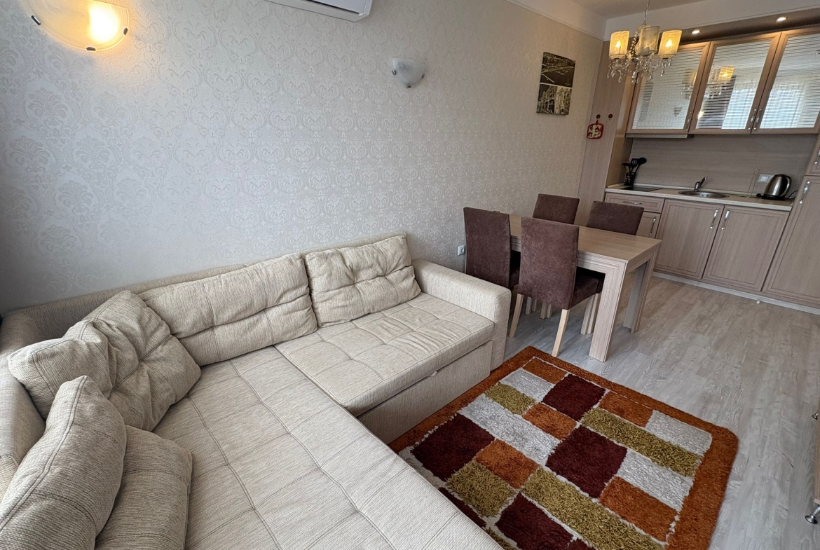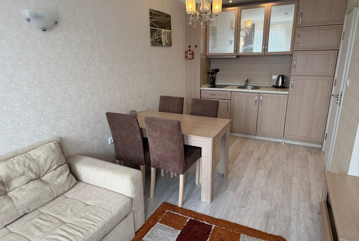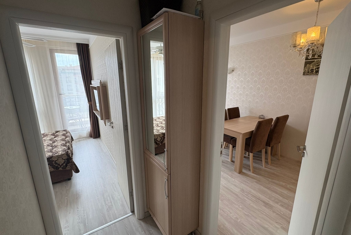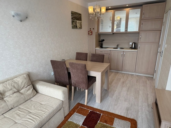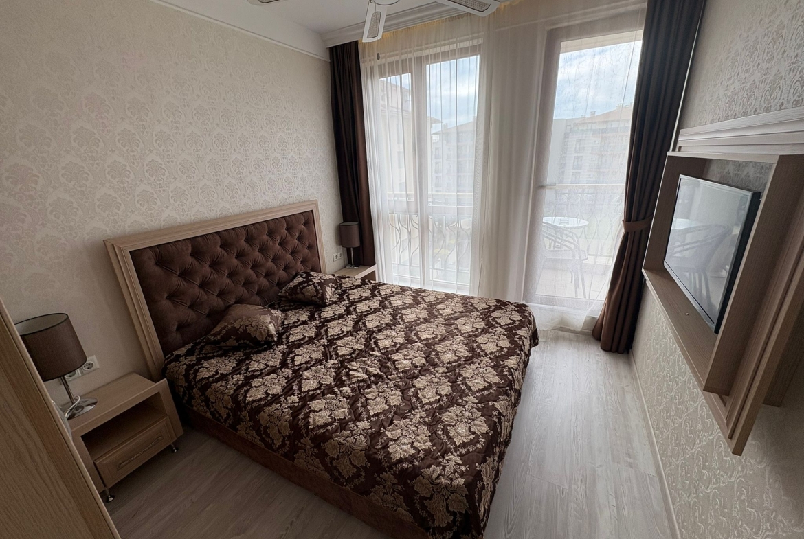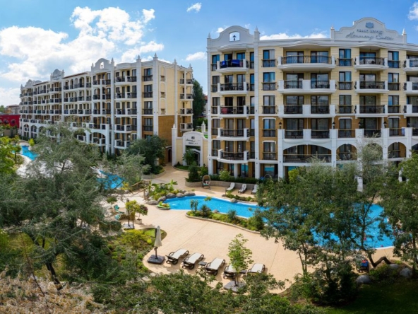 An apartment in Harmony Suites Grand Resort, Sunny Beach, is offered for sale. This apartment is fully furnished and equipped with all necessary appliances.