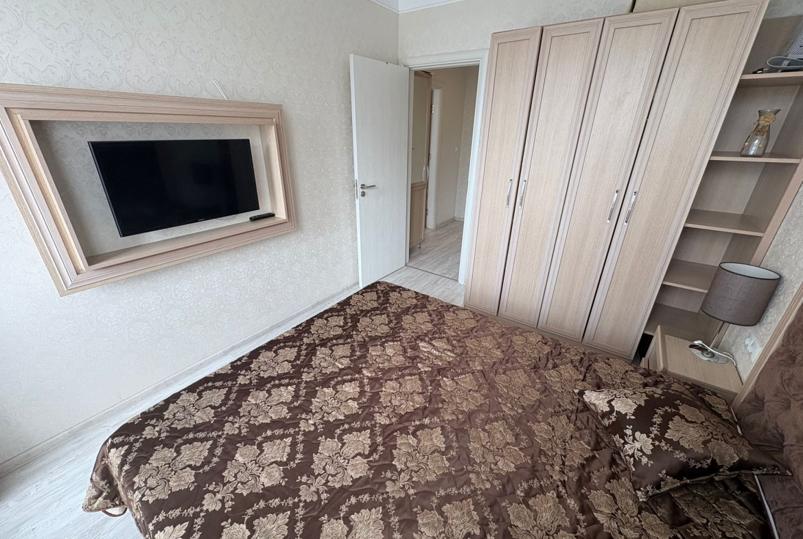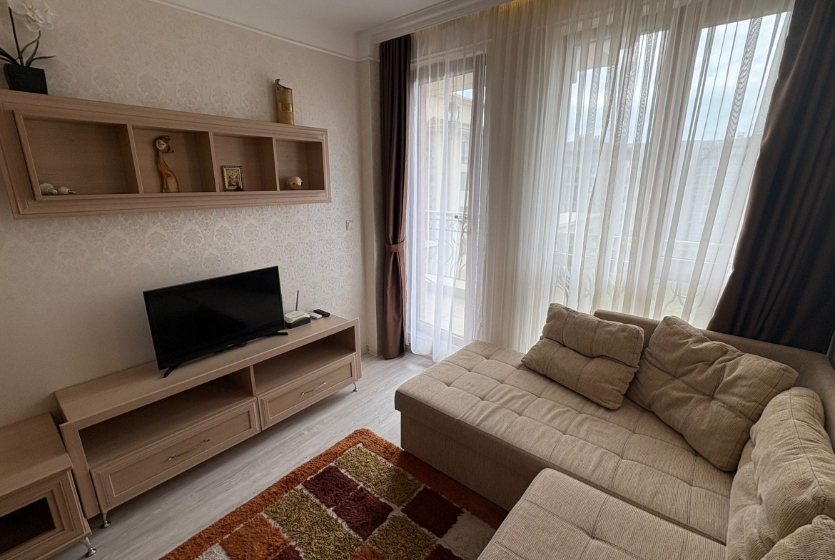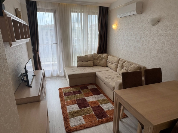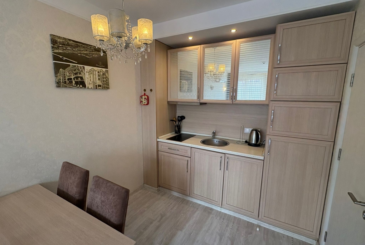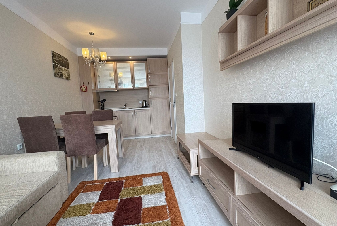 An apartment in Harmony Suites Grand Resort, Sunny Beach, is offered for sale. This apartment is fully furnished and equipped with all necessary appliances.