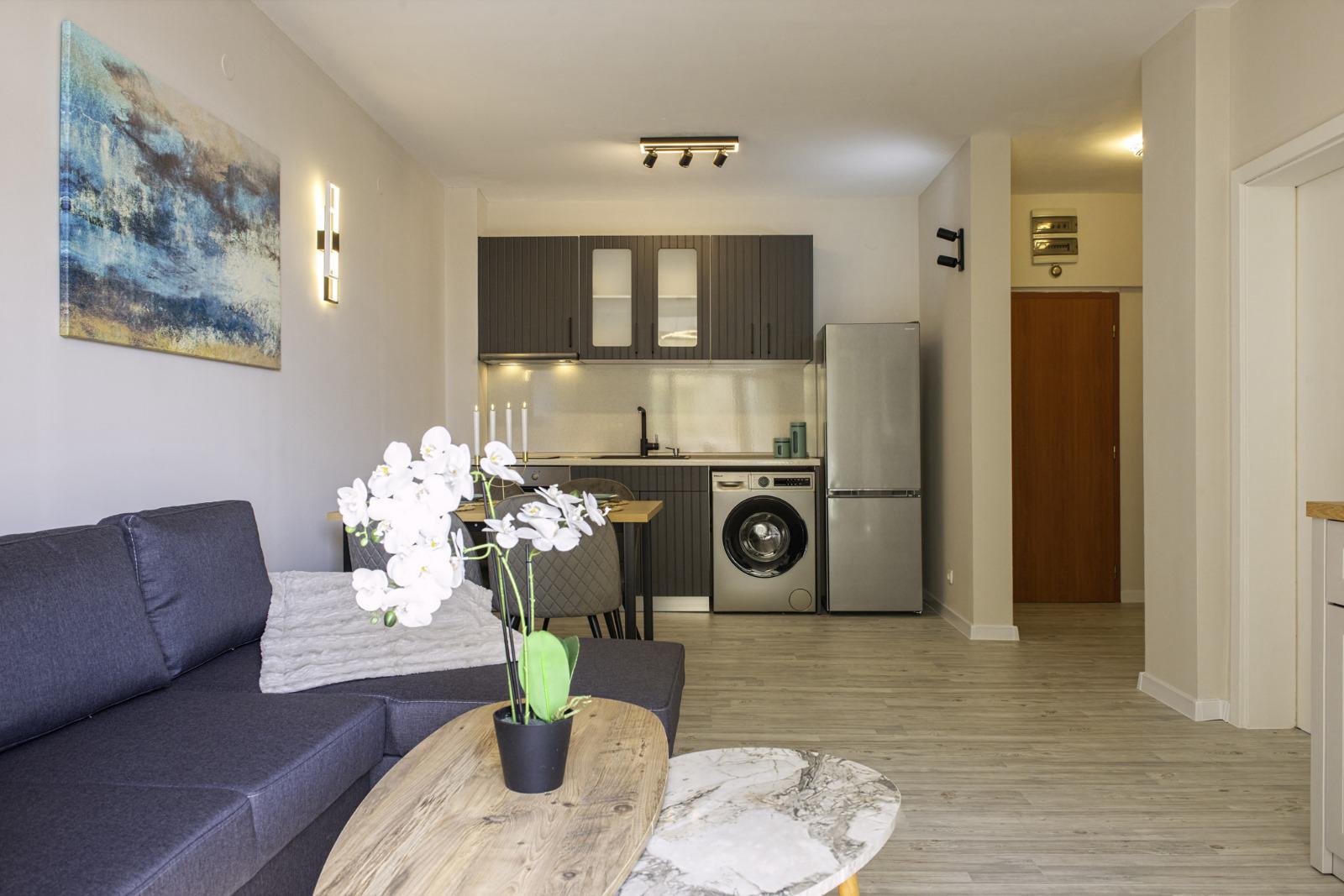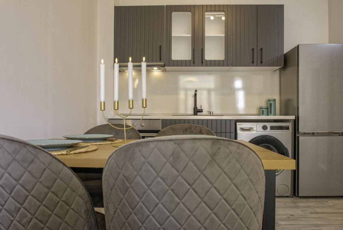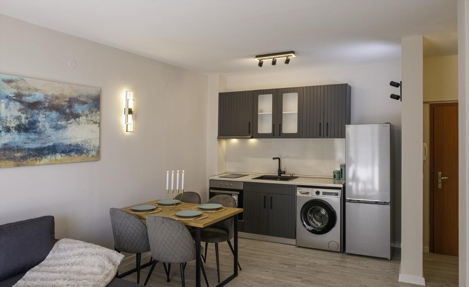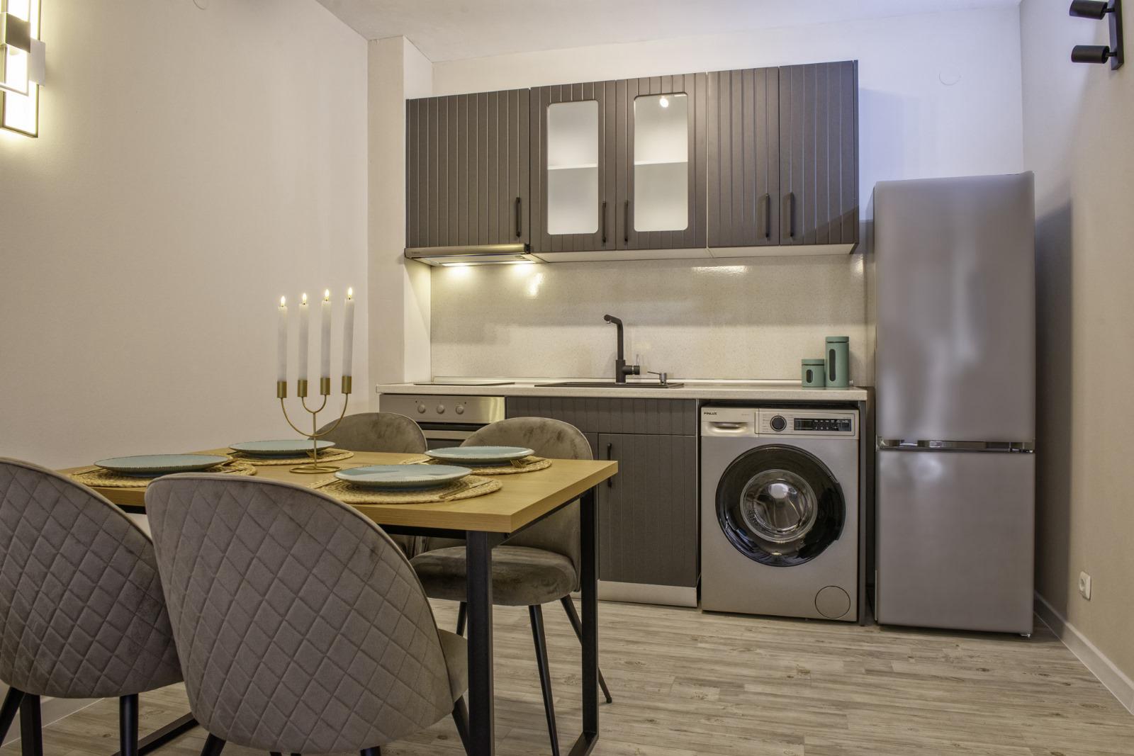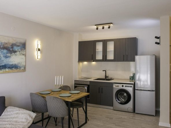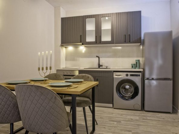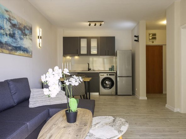 The apartment is sold with furniture and appliances.