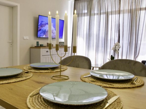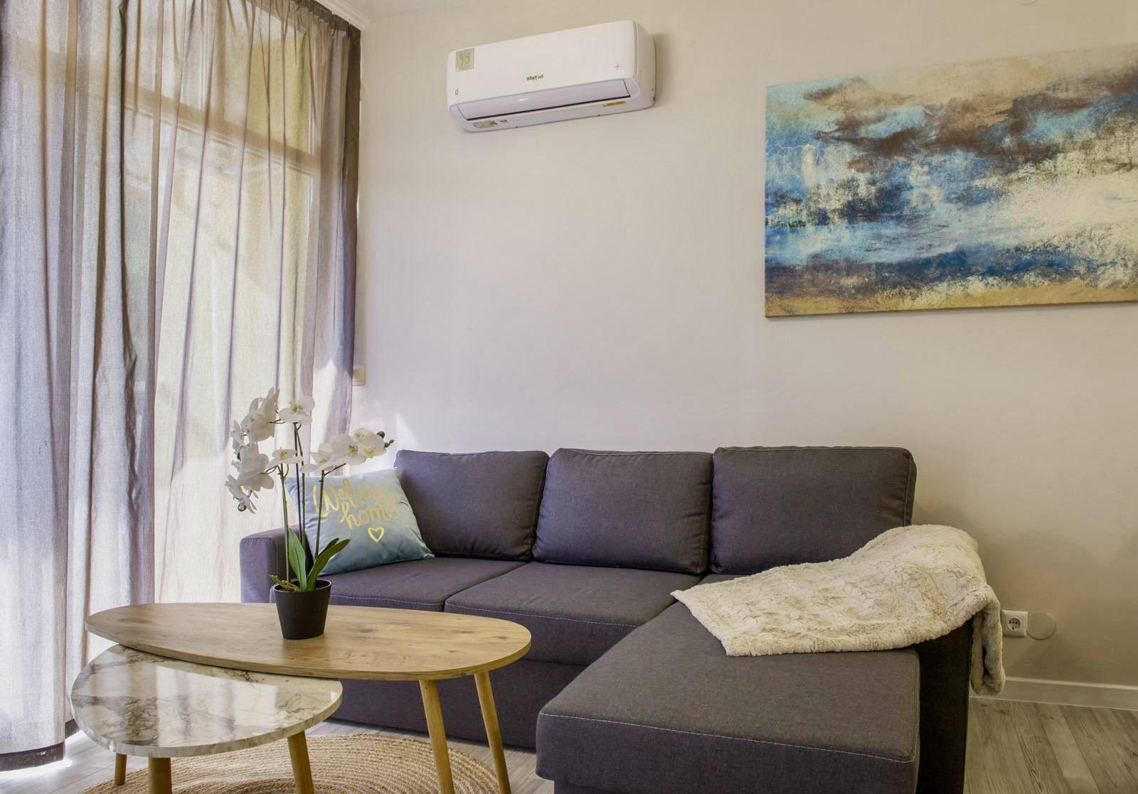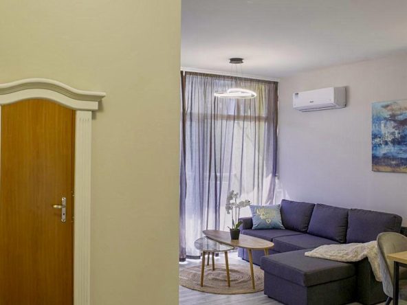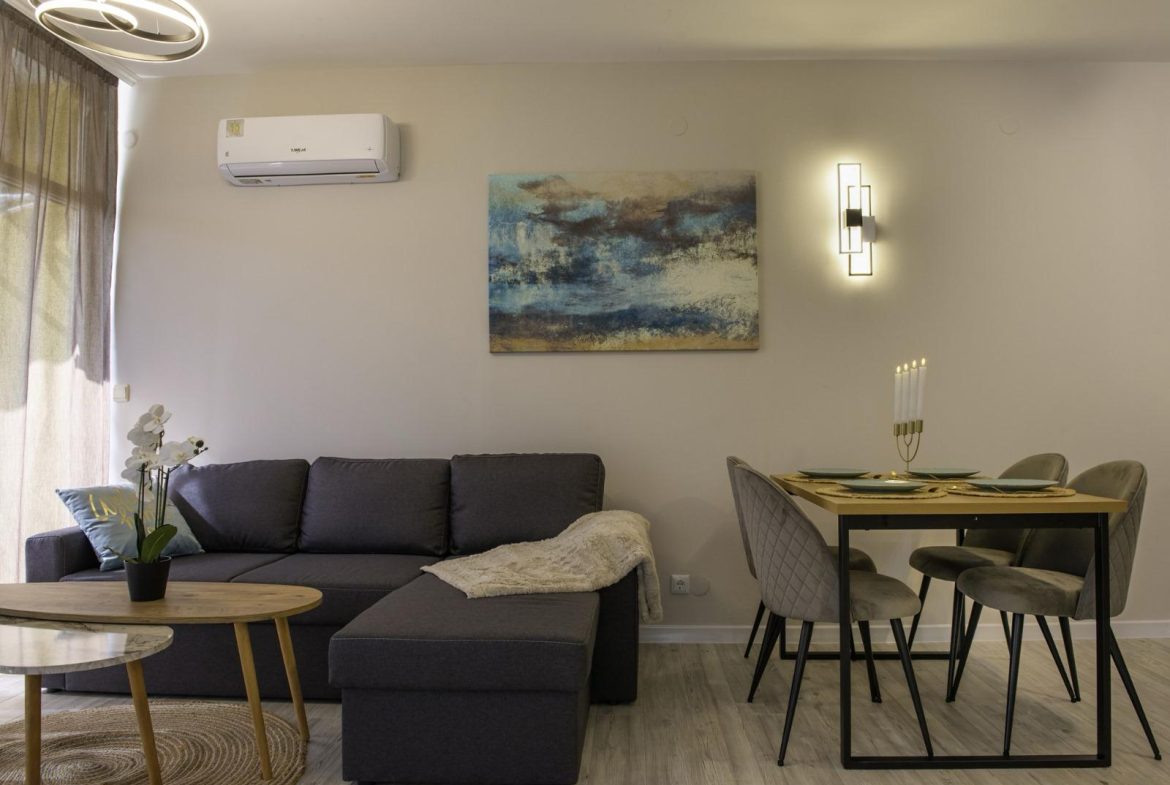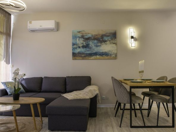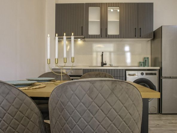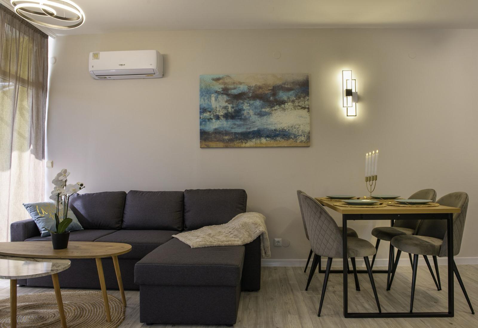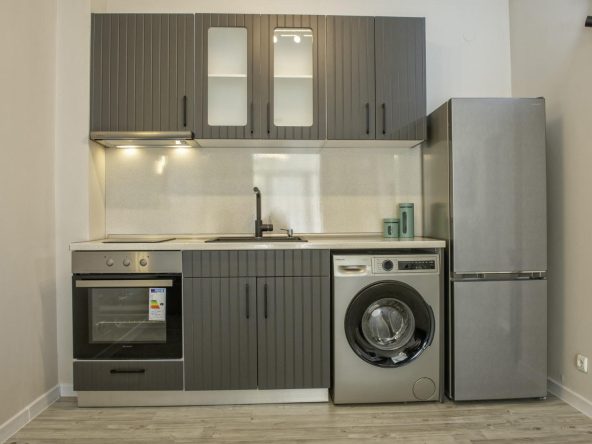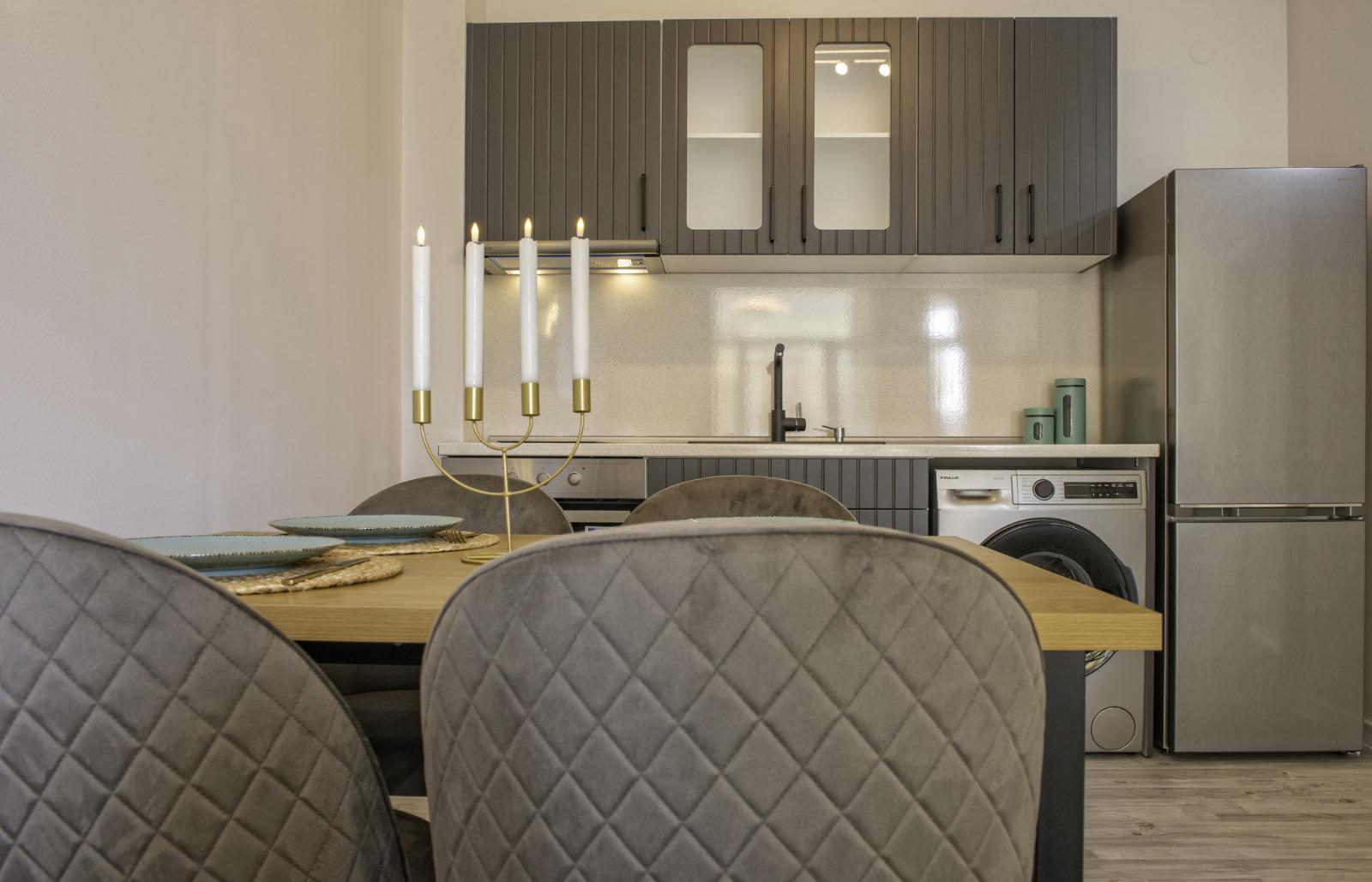 The apartment is sold with furniture and appliances.
